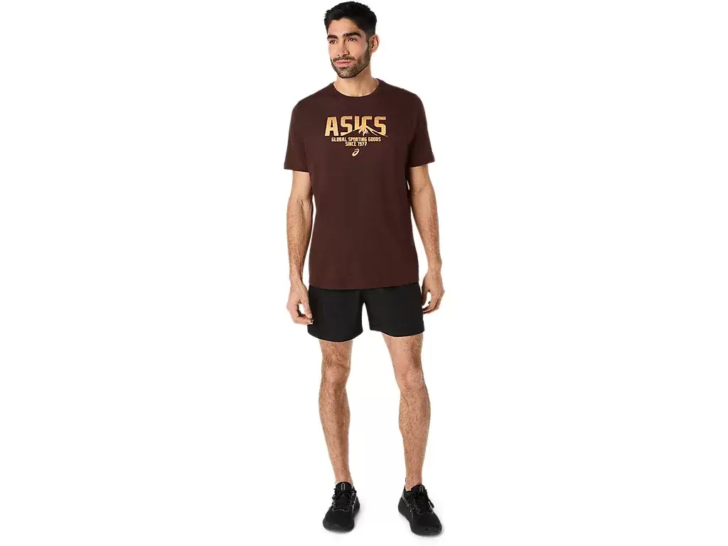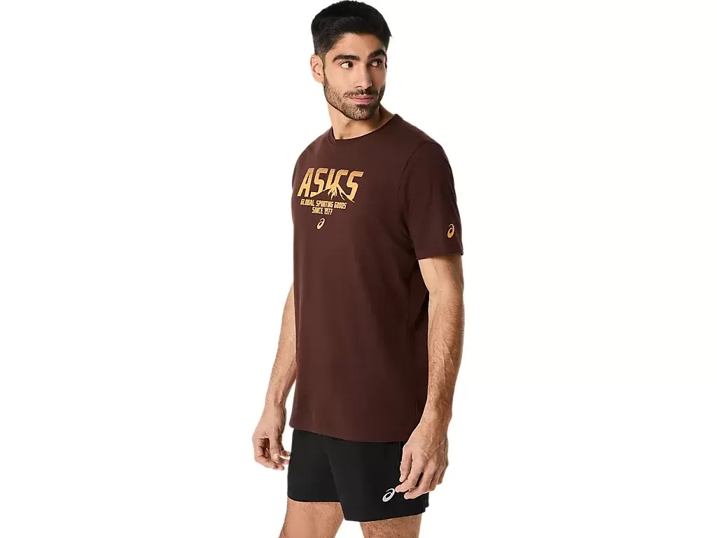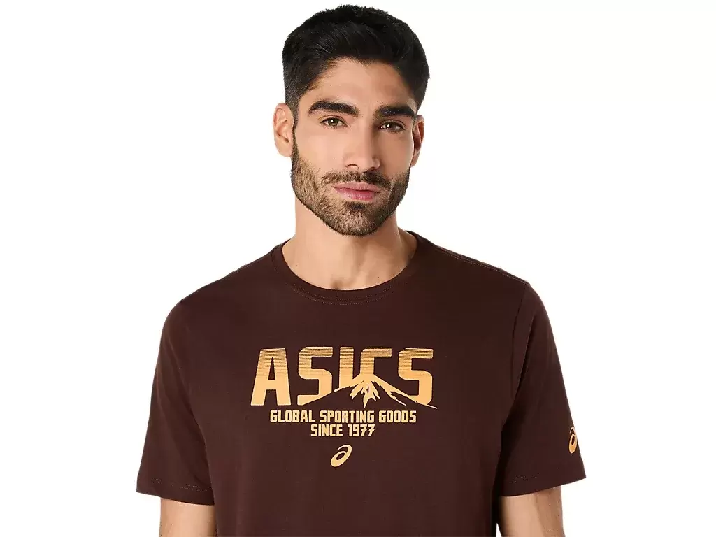 Örme kumaştan üretilen bu üst, çeşitli egzersiz programları için işlevseldir. Bu tişörtün ön tarafında bir ASICS logosu ve tasarıma işlenmiş bir dağ logosu da bulunur.