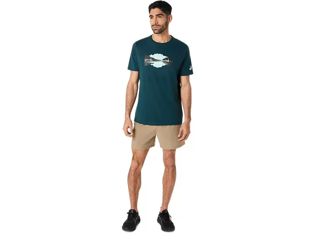Bu rahat örme kısa kollu tişört, doğadan ilham alıyor. Ön grafikte, uzakta dağ zirveleri olan sakin bir göl tasarımı yer alıyor.