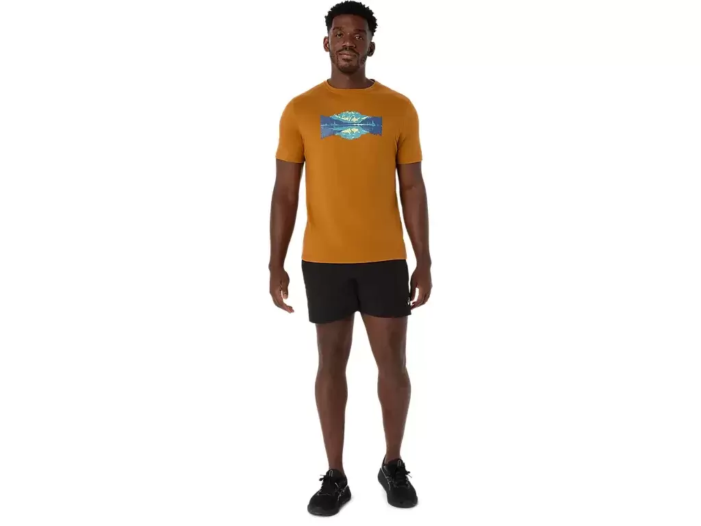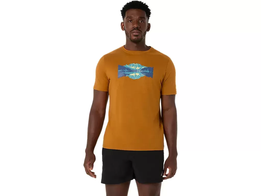 Bu rahat örme kısa kollu tişört, doğadan ilham alıyor. Ön grafikte, uzakta dağ zirveleri olan sakin bir göl tasarımı yer alıyor.