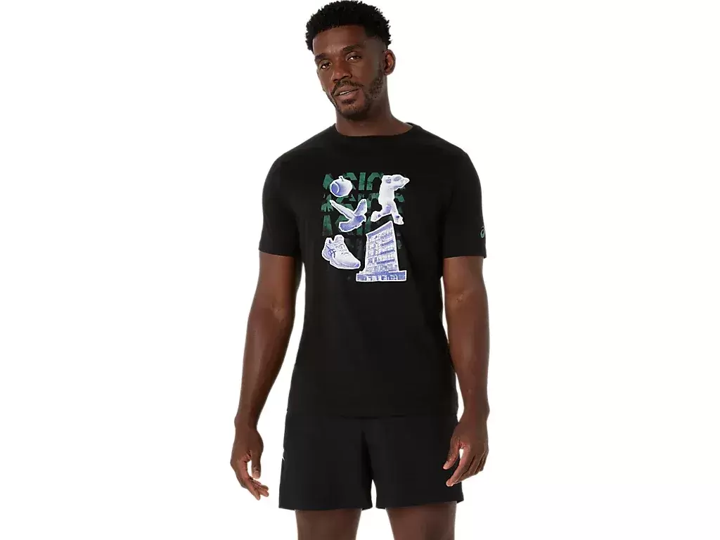 Bu rahat örme kısa kollu tişört, çeşitli New York tenis motiflerinden ve ön taraftaki çeşitli isimler boyunca uygulanan geleneksel grafik uygulamalarından ilham almıştır.