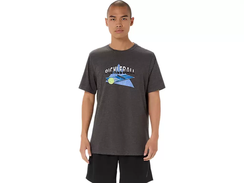 Bu rahat örme kısa kollu tişört, pickleball’dan ilham alıyor. Atari oyunlarını anımsatan bir sanat eseriyle işlenmiş bir pickleball sahası grafiği ve göğüs kısmında “Sorumlu Bir Şekilde İç” ifadesi bulunuyor.