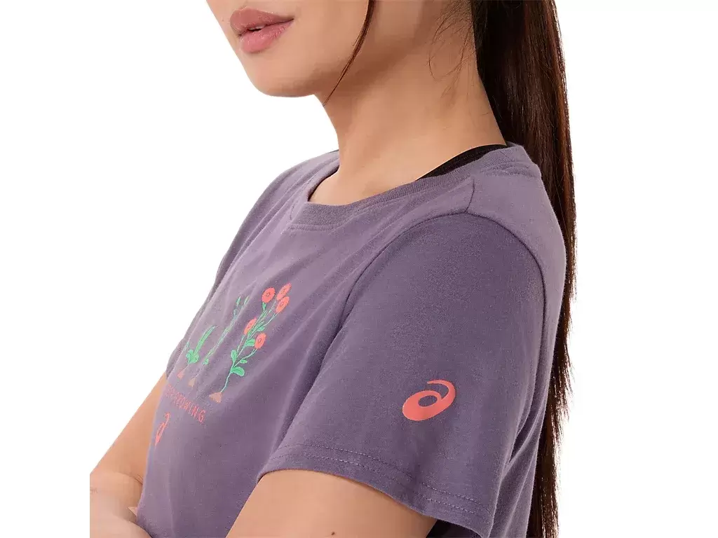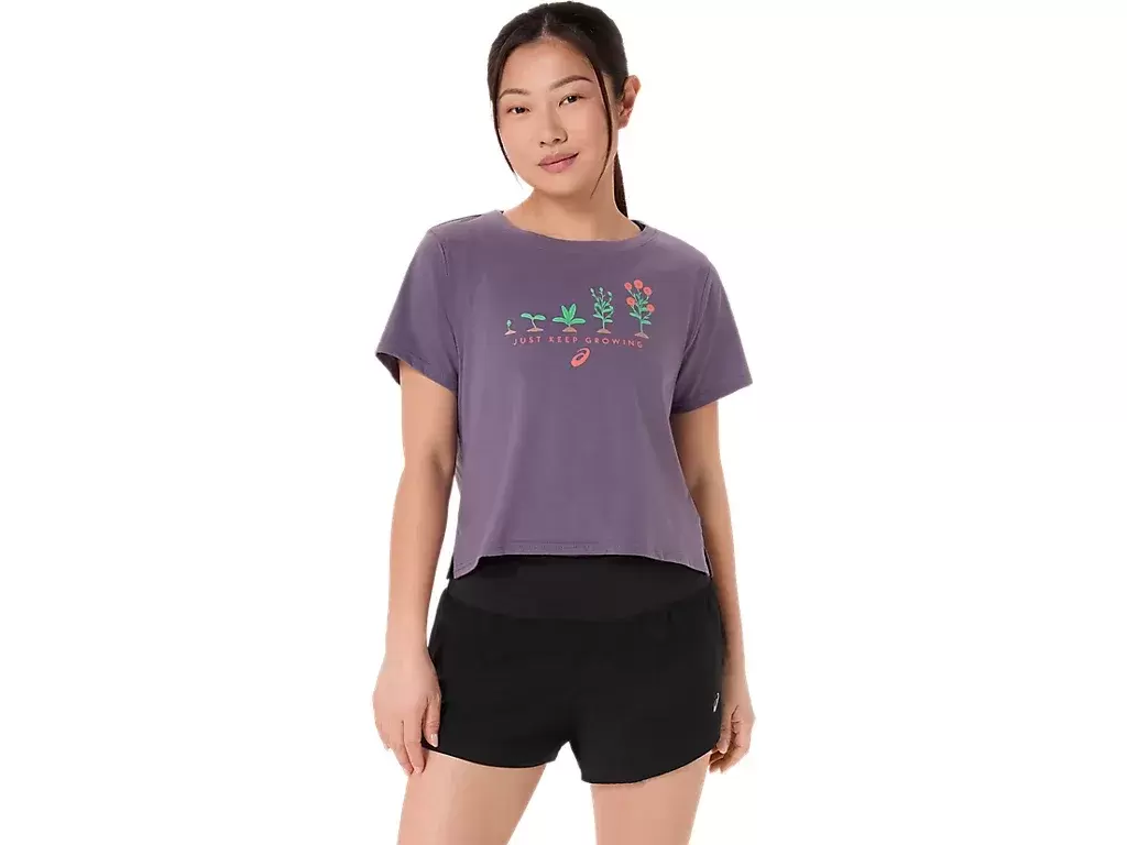 Bu rahat örme kısa kollu tişörtün ön yüzünde, büyüme döngülerinin farklı aşamalarındaki bir dizi bitki grafiği bulunur. Ayrıca altında “SADECE BÜYÜMEYE DEVAM ET” ifadesi yer alır.