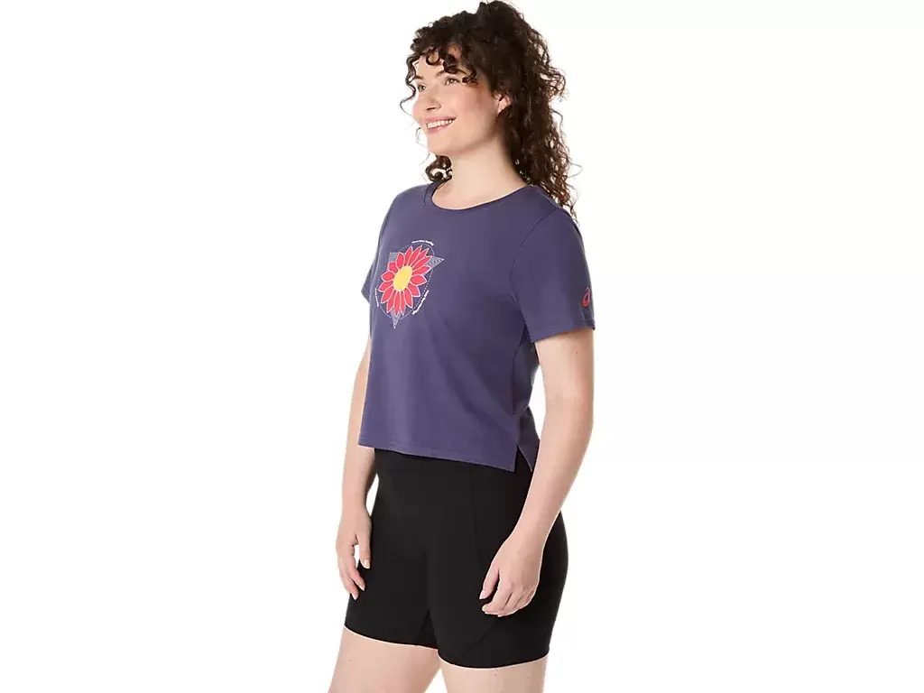 Bu rahat örme kısa kollu tişört, göğüs kısmında ayçiçeği grafiğiyle vurgulanan kısa üst tasarımına sahiptir