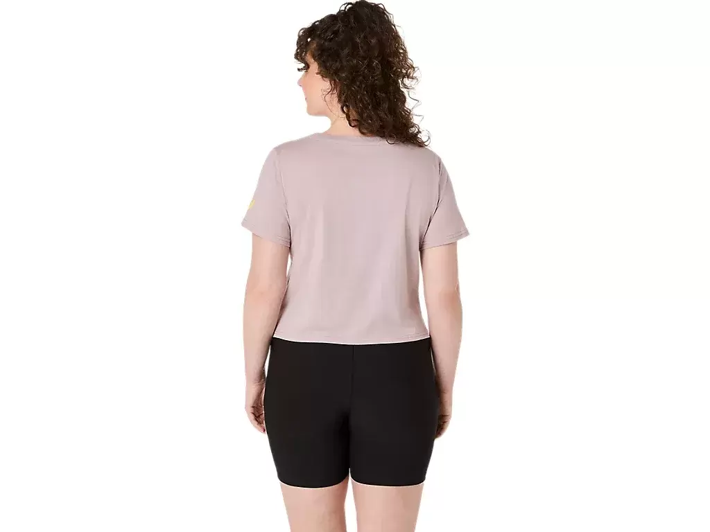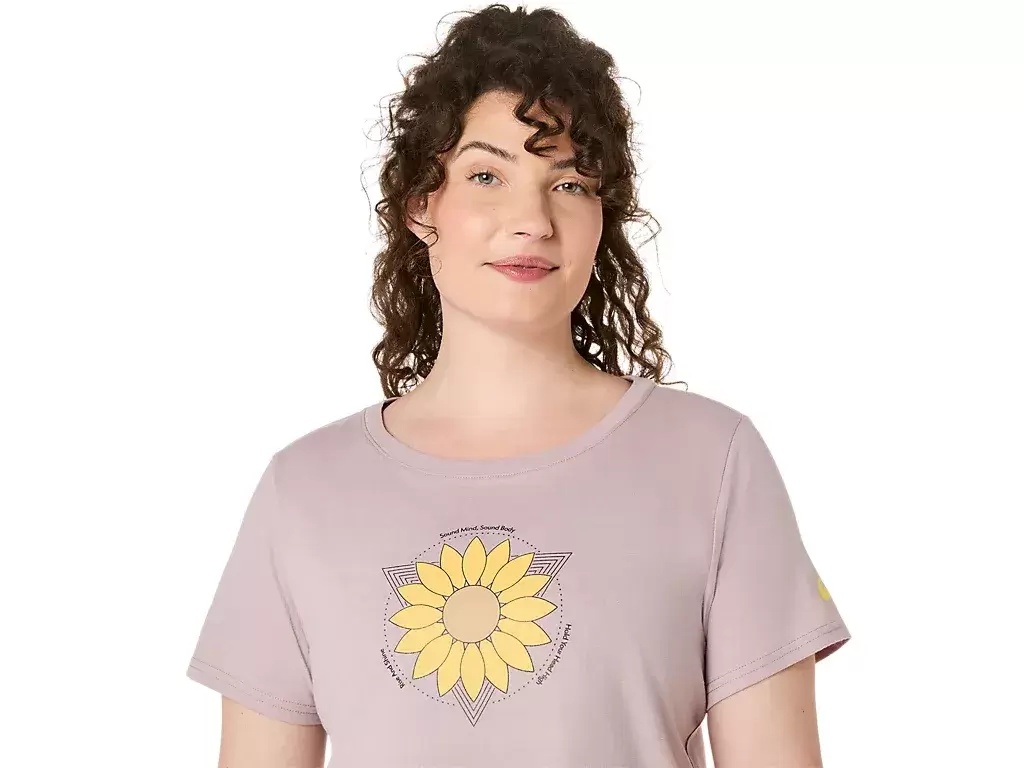Bu rahat örme kısa kollu tişört, göğüs kısmında ayçiçeği grafiğiyle vurgulanan kısa üst tasarımına sahiptir.