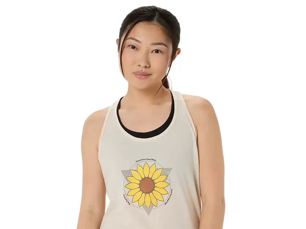 Bu rahat örme kısa kollu tişört, markamızın tarihi boyunca ayçiçeğinin ikonik etkilerine saygı duruşunda bulunuyor. Ortada bir ayçiçeği grafiği yer alıyor ve çevresi çeşitli motivasyon sloganlarıyla vurgulanıyor.