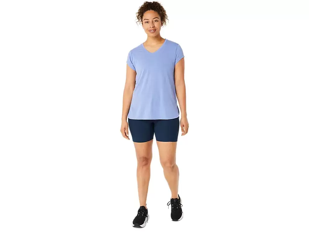 Bu kısa kollu V yakalı üst, cilde şık bir his vermek üzere tasarlanmıştır. Hareket özgürlüğünü artırmak için ileri yan dikişlerle birleştirilmiş rahat örme kumaştan üretilmiştir.